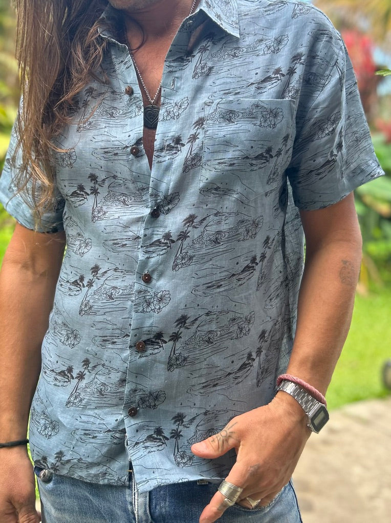 The HANA MAUI aloha shirt in Grey is made with incredibly airy and breathable linen fabric. Keep you cool in the warm weather day and night. Our new design, Hana Maui, is inspired in Hana Maui, Hawai'i and the design was created.